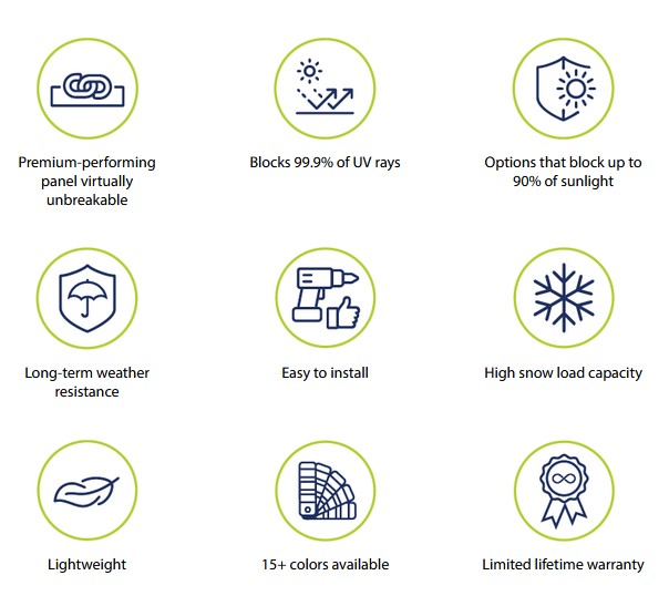 Compared to traditional FRP, SUNSKY has a low yellowing index, offers up to 20X the impact resistance, and features both a high load rating and resistance to wind uplift.